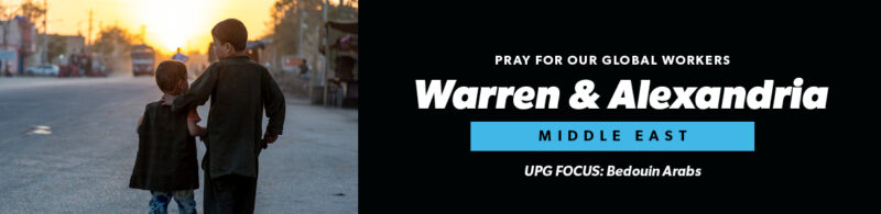 Warren and Alexandra serve a dispersed people group throughout the Middle East and North Africa, sharing the gospel and strengthening a young but growing church. They are committed to building relationships, learning language, and shining the light of Christ in a very dark place as their ministry grows and shifts. Pray for the hearts of those they serve to be eager, for wisdom and endurance for their team, and for the physical, emotional, and spiritual well-being of their family.