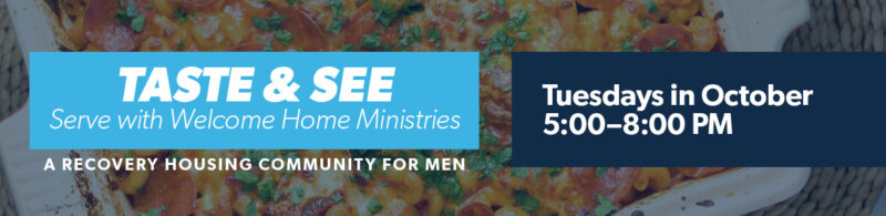 Join us on Tuesday nights in October, from 5:00 to 8:00 p.m., for dinner and fellowship with our partners at Welcome Home Ministries. This is a chance to hear stories of life change, learn about their Christ-centered recovery housing community for men, and discover how you can serve by providing meals, building relationships, and more. To learn more, email [email protected].