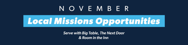 This November, join us in serving our neighbors through three meaningful local missions opportunities—Big Table, The Next Door, and Room in the Inn. Whether you’re distributing gift envelopes to bless service workers, encouraging women in recovery, or preparing meals for those in need, every act of service makes a difference. Step into the story God is writing in our community this month and find your place to serve.