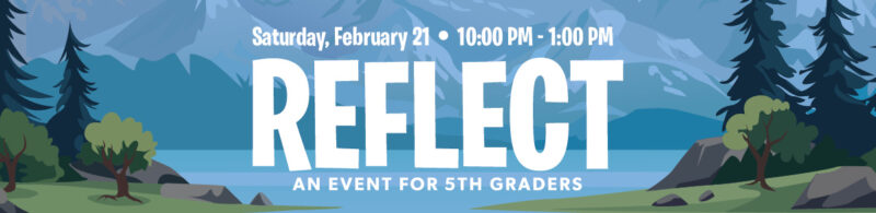 Join us on Saturday, February 21, from 10:00 a.m.–1:00 p.m. in the Kids Area for Reflect—a special event designed to help 5th graders understand their identity in Christ and how to reflect Him in all they do. Students will enjoy intentional discipleship, gender-specific rotations, games, and lunch together. Cost is $15.