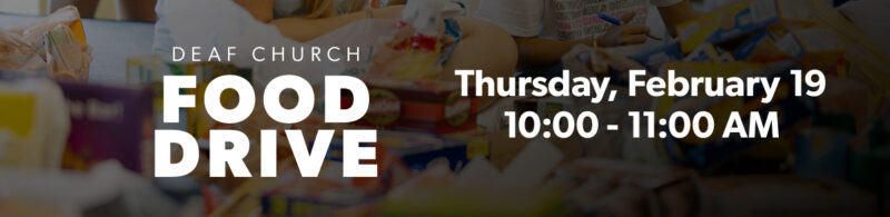 Join us for a Food Drive on Thursday, February 19, from 10:00–11:00 a.m. at Deaf Church. Help support local families by donating food and serving our community in a practical, meaningful way. Every contribution makes a difference.