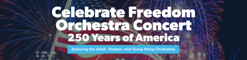 Join us for a special evening as we celebrate 250 years of America at the Celebrate Freedom Orchestra Concert on May 3, from 6:00–7:00 p.m. with a memorable night of music and community. Enjoy this performance by the Adult, Student, and Young String Orchestras as they combine to reflect on this historic milestone together. Mark your calendar, bring a friend, and be part of this exciting celebration.