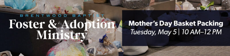 Join us on Tuesday, May 5, from 10:00 a.m.–12:00 p.m. as we prepare for our Foster & Adoption Mother’s Day Brunch by packing gift baskets for the moms who will attend. You can also be part of this by purchasing and donating items throughout April using our Amazon Wishlist or by bringing items to campus. Come lend a hand and help us bless these families in a meaningful way.